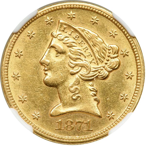 1871-CC $5 Liberty. NGC graded AU-58. Well struck and untoned. Only 20,770 struck. Very rare date in Mint State and priced to the moon, well away from the reach of most collectors (see populations below). For AU58, what you get is a satin-fresh beauty whose agreeable mint frost within expands around and on top of the devices covering a good 70% or more of the surface. Level, rolling luster, it is, frosted and almost granular plus free from heavy abrasions that so commonly plague early CC-mint half eagles. There are choice quality surfaces and then there are choice quality surfaces, with this handsome offering one of the latter.