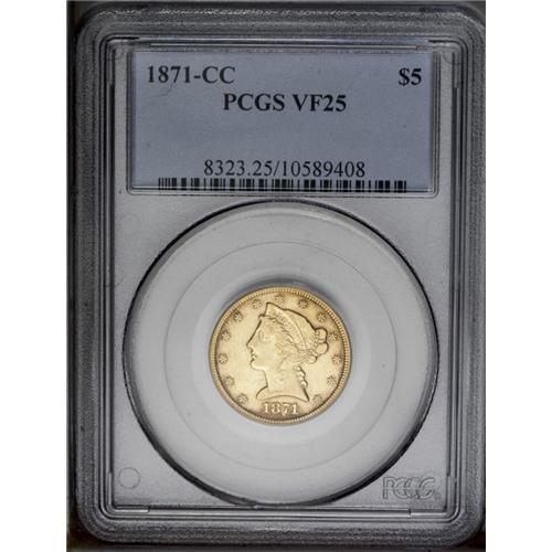 <B>1871-CC<$5> VF25 PCGS.</B></I> A straw-gold coin from the storied Carson City Mint, with moderate, well-distributed wear and handling marks consistent with some time in circulation. An attractive mid-grade example that would be a welcome addition to almost any collection.