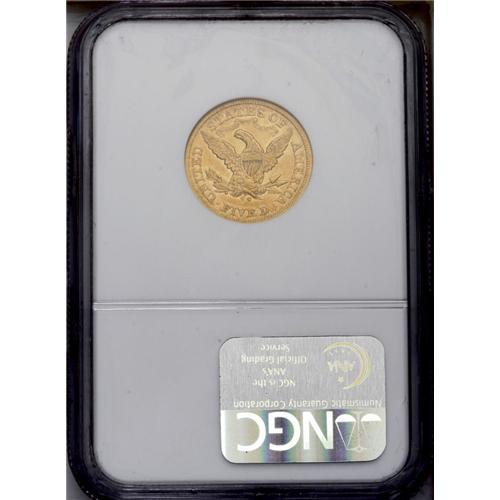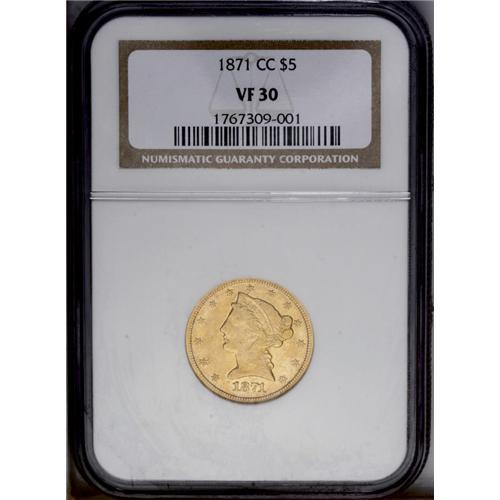 <B>1871-CC<$5> VF30 NGC.</B></I> Variety 1-A. A scarce CC-mint issue, from a mintage of about 21,000 pieces. This coin actually shows quite a bit of luster remaining beneath a light copper-gold patina, despite the nameplate 30 points of wear. Not surprisingly, there are quite a few unbothersome abrasions, scrapes, and handling marks, yet the overall appeal is quite high and the strike is well executed.<BR><I>From The Steve Glenn Collection.</B></I> <BR><BR><B>Important notice:</B> Heritage usually auctions material at the rate of 200-250 lots per hour. On some occasions eBay Live bid software or the Internet may not be able to keep up with the pace of the auction. We recommend placing a realistic absentee bid now as insurance to avoid disappointment. Occasionally the auctioneer may eliminate or reject an eBay Live bid, and the auctioneer may also reopen a lot after the close of the eBay live bidding (usually because we missed an audience bid), and may reject your bid even if it shows you as the winning bidder. By bidding via eBay Live, you agree that Heritage may award the lot to another bidder at its sole discretion under the circumstances described above or any other reasonable circumstances. Since eBay bids are not shown to us until we open the lot on the floor, we treat those bids just like floor bids. In most cases the floor responds before the eBay bid is presented to us, due to Internet lag time, so for consistency we have made it a policy that floor bids are always considered first over tie eBay live bids. Also please note that all Heritage lots purchased through eBay Live carry a 20% Buyer's Premium. Please make sure you read the Terms and Conditions before you bid. This lot is being auctioned in conjunction with a live floor auction by Heritage Galleries & Auctioneers. All final auction and invoice information will be supplied by Heritage Galleries & Auctioneers, and all other information should be considered preliminary. Lot:2779 <BR><BR><B>Winning Notification and Billing:</B> After the FINAL session in this auction is complete, Heritage will send e-mail and snail mail invoices. This process normally takes several days. All final auction and invoice information will be supplied by Heritage Galleries & Auctioneers, and all other information should be considered preliminary. <BR><BR>This auction will be conducted on a live auction floor and over the Internet through eBay Live. If you choose to place an absentee bid, please take a moment to <font color='#0000ff'><u><a href='http://pages.ebay.com/liveauctions/help/before/laabsentee.html'>learn how eBay Live absentee bidding works</a></u></font><font color='#000000'>
