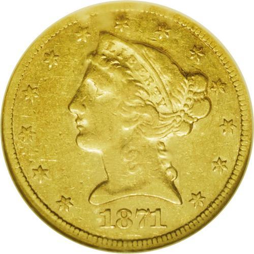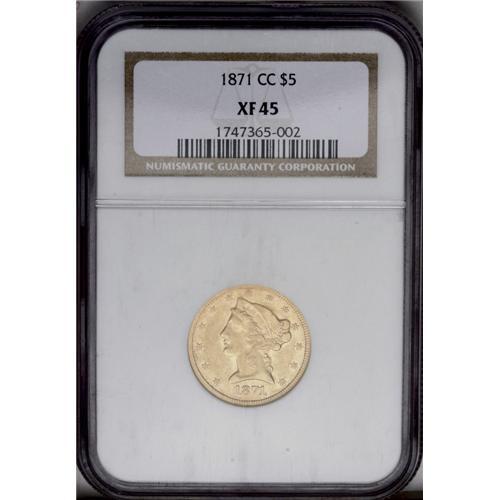 <B>1871-CC<$5> XF45 NGC.</B></I> Variety 1-A. The somewhat subdued surfaces display even wear and noticeable luster remnants. The straw-gold coloration is supplemented by reddish tinges. Rare in all grades with a mintage of only 20,770 pieces, the '71-CC is very elusive in XF or better condition. Census: 13 in 45, 25 finer (4/06).