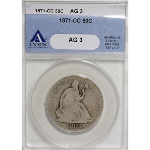 <B>1871-CC 50C AG3 ANACS.</B></I> NGC Census: (0/29). PCGS Population (3/77). Mintage: 153,950. Numismedia Wsl. Price for NGC/PCGS coin in AG3 : $103. (#6331)<BR><BR><B>Coin Engraver:</B> Christian Gobrecht<BR><BR><b>Shipping:</b> Coins & Currency (<a target="_blank" href="http://www.heritageauctions.com/common/shipping.php">view shipping information</a>)