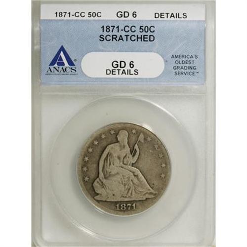 <B>1871-CC 50C --Scratched--ANACS. G6 Details.</B></I> NGC Census: (0/29). PCGS Population (2/76). Mintage: 153,950. Numismedia Wsl. Price for NGC/PCGS coin in G6 : $272. (#6331)<BR><BR><B>Coin Engraver:</B> Christian Gobrecht<BR><BR><b>Shipping:</b> Coins & Currency (<a target="_blank" href="http://www.heritageauctions.com/common/shipping.php">view shipping information</a>)