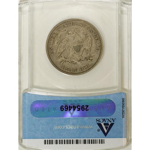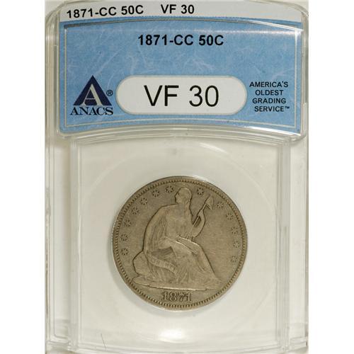 <B>1871-CC 50C VF30 ANACS.</B></I> LIBERTY is fully legible, and only the E is faint. This stone-gray early Carson City half has subdued marks beneath the eagle's beak and left (facing) wing.<BR><I>From The Hoosier Discovery Collection.</B></I><BR><BR><b>Shipping:</b> Coins & Currency (<a target="_blank" href="http://www.heritageauctions.com/common/shipping.php">view shipping information</a>)