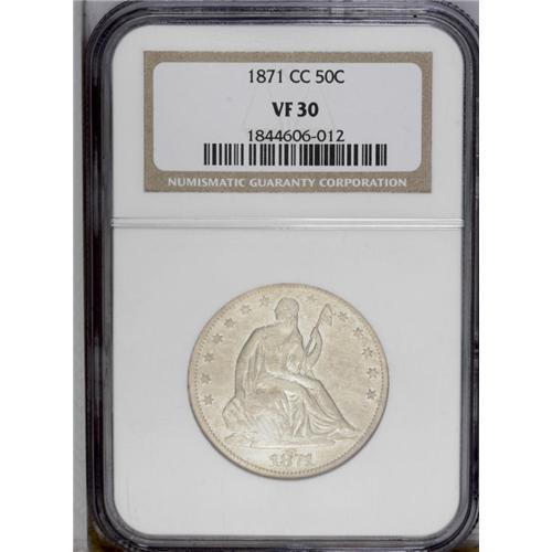<B>1871-CC<50C> VF30 NGC.</B></I> An early and scarce Carson City half dollar that retains ample glimpses of mint luster within protected areas of the design. A bold chestnut-gray piece with subdued, lightly marked surfaces. Census: 13 in 30, 23 finer (2/06).