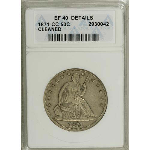 <B>1871-CC 50C --Cleaned--ANACS. XF40 Details.</B></I> Well struck and retoned rose-gray over each side. Light hairlines are evident in the fields, and the devices exhibit a degree of even wear.<BR><I>From The Edward Sacks Collection.</B></I><BR><BR><b>Shipping:</b> Coins & Currency (<a target="_blank" href="http://www.heritageauctions.com/common/shipping.php">view shipping information</a>)
