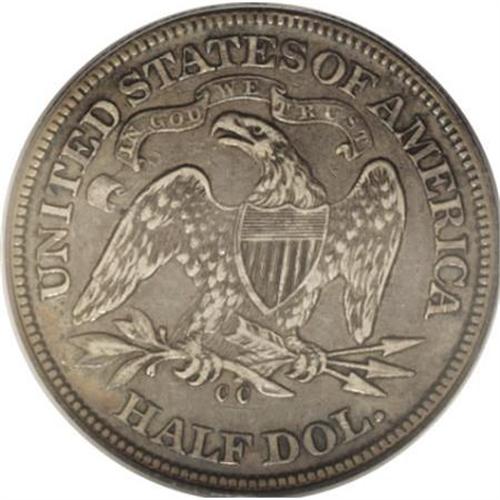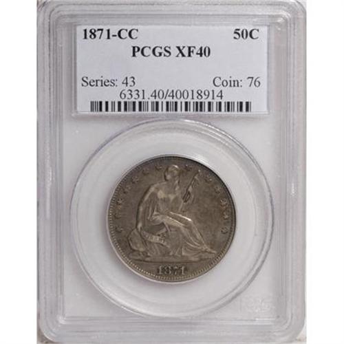 <B>1871-CC 50C XF40 PCGS.</B></I> The 1871-CC half dollar is quite scarce overall. Randy Wiley and Bill Bugert (1993) assign an R.5 rarity rating in XF condition. Medium golden-gray toning accented with lavender and sky-blue bathes both sides of the XF40 specimen in this lot. Good definition is noted on all of the design elements, and the surfaces are refreshingly clean for a coin that saw some circulation. Population: 11 in 40, 29 finer (6/07). <BR><BR><b>Shipping:</b> Coins & Currency (<a target="_blank" href="http://www.heritageauctions.com/common/shipping.php">view shipping information</a>)