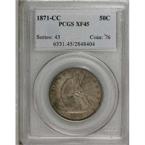 <B>1871-CC 50C XF45 PCGS.</B></I> For a coin with a mintage of 153,950 pieces one would expect a greater availability than is found with the 1871-CC half. However, virtually all the mintage went into circulation and stayed there. For the collector, it is not a question of what grade would one like; rather, it is a question of whether a '71-CC can be found at all. This is a pleasing, evenly circulated example that has light gray patina over each side and darker accents around the reverse devices. <BR><BR><B>Coin Engraver:</B> Christian Gobrecht<BR><BR><b>Shipping:</b> Coins & Currency (<a target="_blank" href="http://www.heritageauctions.com/common/shipping.php">view shipping information</a>)