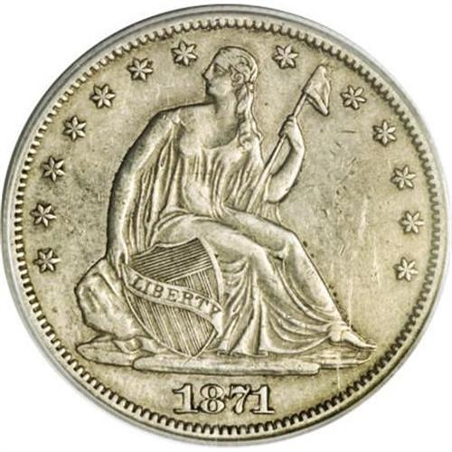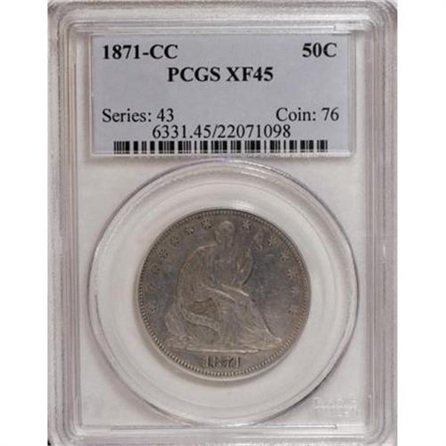 <B>1871-CC 50C XF45 PCGS.</B></I> Pleasing medium gray with darker steel toning over part of the reverse. This lightly worn piece is an attractive representative of the elusive date. The usual light handling marks are evident in the fields and on the devices on both sides of this piece. Population: 11 in 45, 21 finer (1/08).<BR><BR><B>Coin Engraver:</B> Christian Gobrecht<BR><BR><b>Shipping:</b> Coins & Currency (<a target="_blank" href="http://www.heritageauctions.com/common/shipping.php">view shipping information</a>)