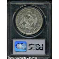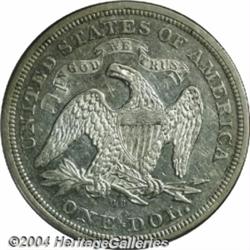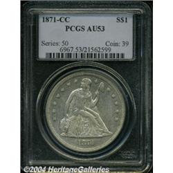 <B>1871-CC<S$1> AU53 PCGS.</B></I> A famous Seated Dollar issue that has been highly respected (and highly valued) for decades. Apparently the rarity of this issue was recognized at an early date as there is a substantially higher percentage of survivors (some 6-9% of the 1,376 pieces minted) than other Seated Dollar issues. Lightly worn over the devices, the surfaces are mostly untoned and show numerous wispy hairlines in the fields, but no real abrasions as such. Population: 6 in 53, 11 finer (3/04). <BR><BR><B>Important notice:</B> Heritage usually auctions material at the rate of 200-250 lots per hour. On some occasions eBay Live bid software or the Internet may not be able to keep up with the pace of the auction. We recommend placing a realistic absentee bid now as insurance to avoid disappointment. Occasionally the auctioneer may eliminate or reject an eBay Live bid, and the auctioneer may also reopen a lot after the close of the eBay live bidding (usually because we missed an audience bid), and may reject your bid even if it shows you as the winning bidder. By bidding via eBay Live, you agree that Heritage may award the lot to another bidder at its sole discretion under the circumstances described above or any other reasonable circumstances. Since eBay bids are not shown to us until we open the lot on the floor, we treat those bids just like floor bids. In most cases the floor responds before the eBay bid is presented to us, due to Internet lag time, so for consistency we have made it a policy that floor bids are always considered first over tie eBay live bids. Also please note that all Heritage lots purchased through eBay Live carry a 20% Buyer's Premium. Please make sure you read the Terms and Conditions before you bid. </span></font></tr></table></td></tr></table>