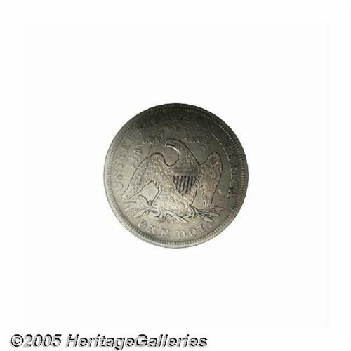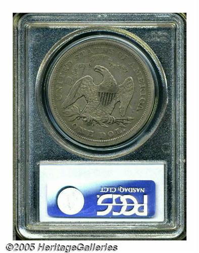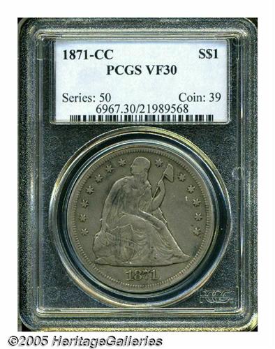 <B>1871-CC<S$1> VF30 PCGS.</B></I> This important dollar is from the second year of production at the new Carson City Mint, and has the lowest mintage of any Seated dollar from this facility. Just 1,376 coins were produced. Probably a little less than 10% of the original mintage survives today; somewhere around 100 coins. Most are considerably worn and/or damaged. The present Choice VF example is an exception. It displays light to medium gray patination with subtle gold and sky-blue undertones. The surfaces are remarkably clean, revealing just a few minute, unoffensive marks. The design elements are well defined, though the lower parts of the letters BE in LIBERTY are weak. A light toning streak runs vertically through the obverse shield. Population: 5 in 30, 56 finer (6/05).