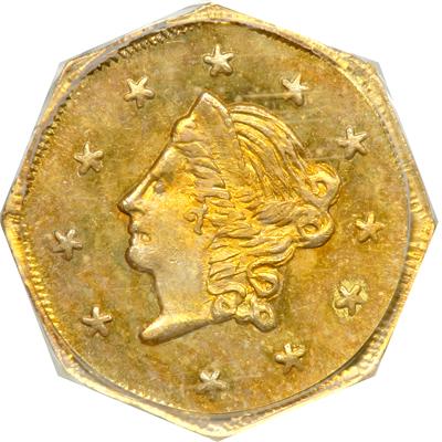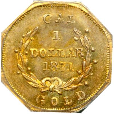 1871 Dollar Octagonal BG-1104. PCGS graded MS-65 R-4. Old green holder. Rich golden toning with prooflike surfaces. The dollar denomination is the scarcest in this series, with really high end Mint States like the present coin few and far between (hence, the low population figure). The present example has outstanding detail and color, with a plethora of reflective luster shining forth from the fields on both sides. Pop 3; none finer at PCGS. (PCGS # 10915).