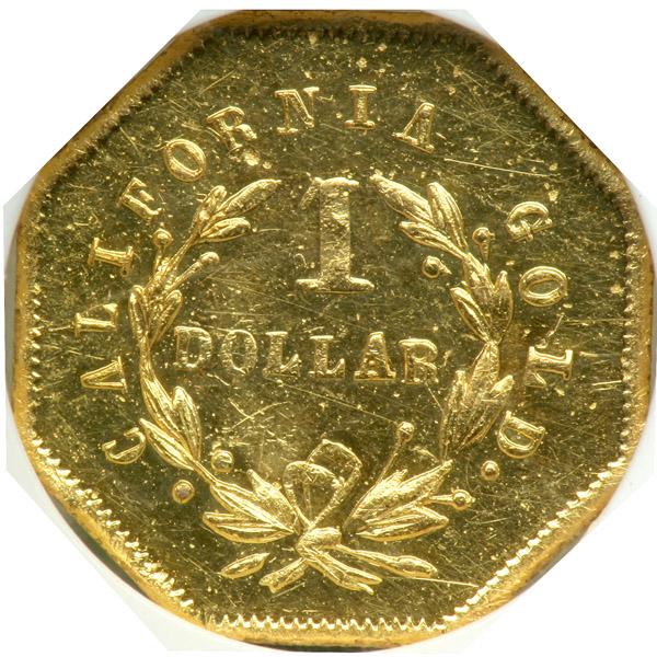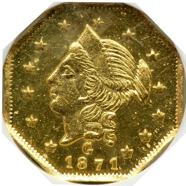 1871 Dollar Octagonal. Breen and Gillio-1109. Low Rarity 4. NGC graded MS-62 Prooflike. Brilliant and untoned with gleaming surfaces. A desirable Period Two item struck by Robert B. Gray Co., whose large initial G appears above the date. Pop 3; 3 finer.