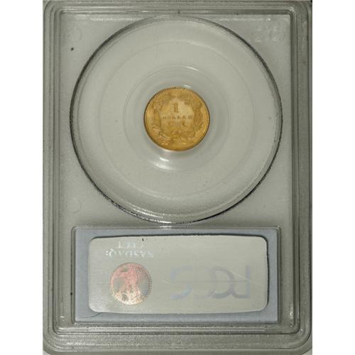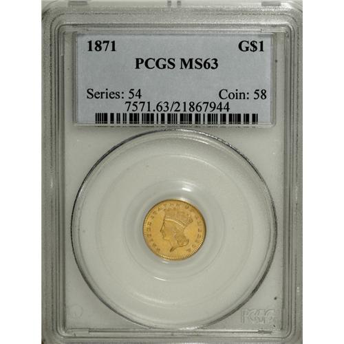 <B>1871 G$1 MS63 PCGS.</B></I> The prooflikeness in the fields is partially subdued by a thin layer of milky patina on each side. This Select example is well struck, with attractive coloration and few grade-limiting marks.<BR><BR><b>Shipping:</b> Coins & Currency (<a target="_blank" href="http://www.heritageauctions.com/common/shipping.php">view shipping information</a>)