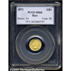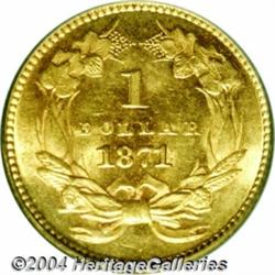 <B>1871<G$1> MS64 PCGS.</B></I> Ex: Bass. Previously described by the staff at Bowers and Merena in the <I>Harry W. Bass, Part Two</B></I> catalog as "Brilliant, frosty yellow gold lustre (sic) with sharp design details and considerable eye appeal. Certainly among the finest of survivors of this low-mintage date. In 1968, Stack's described this as "a lovely First Strike."<BR> Since that time, a notable amount of dark surface buildup has accumulated primarily on the obverse. We recommend a close examination by all perspective buyers. Population: 13 in 64, 22 finer (3/04). <BR><BR><B>Important notice:</B> Heritage usually auctions material at the rate of 200-250 lots per hour. On some occasions eBay Live bid software or the Internet may not be able to keep up with the pace of the auction. We recommend placing a realistic absentee bid now as insurance to avoid disappointment. Occasionally the auctioneer may eliminate or reject an eBay Live bid, and the auctioneer may also reopen a lot after the close of the eBay live bidding (usually because we missed an audience bid), and may reject your bid even if it shows you as the winning bidder. By bidding via eBay Live, you agree that Heritage may award the lot to another bidder at its sole discretion under the circumstances described above or any other reasonable circumstances. Since eBay bids are not shown to us until we open the lot on the floor, we treat those bids just like floor bids. In most cases the floor responds before the eBay bid is presented to us, due to Internet lag time, so for consistency we have made it a policy that floor bids are always considered first over tie eBay live bids. Also please note that all Heritage lots purchased through eBay Live carry a 20% Buyer's Premium. Please make sure you read the Terms and Conditions before you bid. </span></font></tr></table></td></tr></table>