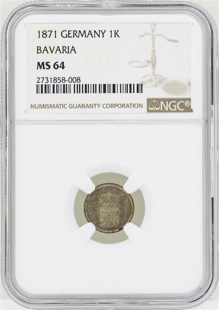 One 1871 Germany Kreuzer Bavaria Coin NGC MS64. NGC Certified.