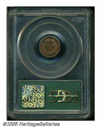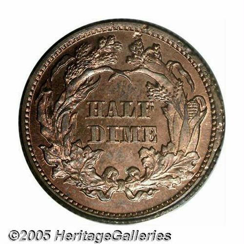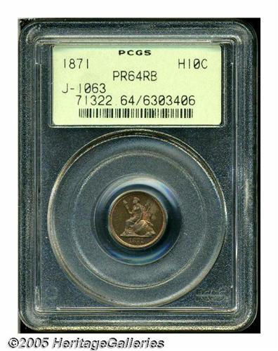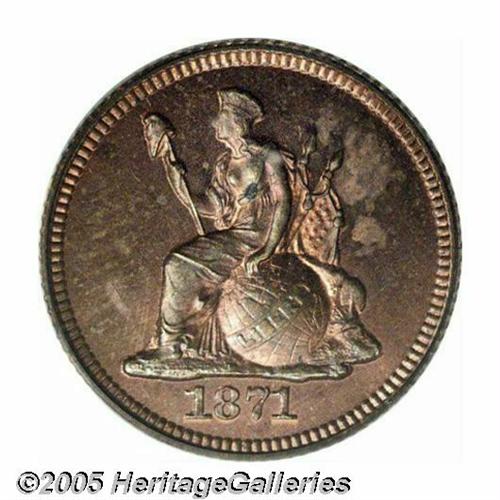 <B>1871<H10C> Half Dime, Judd-1063, Pollock-1198, R.7, PR64 Red and Brown PCGS.</B></I> Longacre's Indian Princess design with Liberty seated and wearing an Indian headdress, one hand resting on a globe, the other holding a Liberty Pole, with conjoined flags behind. The reverse is the regular issue for Liberty Seated half dimes. Struck in copper with a reeded edge. This design was apparently implemented by William Barber as Longacre died in 1869. About a half dozen pieces are known of this rare pattern. The fields are deeply mirrored and much of the original red color is still in evidence with a light overlay of brown present. Traces of a fingerprint are seen on each side.<BR><I>From The Western Hills Collection.</B></I>