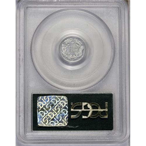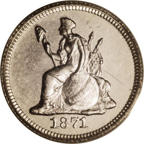 <B>1871<H10C> Half Dime, Judd-1064, Pollock-1199, R.8, PR64 PCGS.</B></I> Longacre's Indian Princess design with Liberty seated and wearing an Indian headdress, one hand resting on a globe, the other holding a Liberty pole, with conjoined flags behind. The reverse is the regular issue for Liberty Seated half dimes. Struck in aluminum with a reeded edge. Much brilliance flashes over bright, lightly toned surfaces. A small diagonal mark is noted in the right obverse field, this being mentioned to help identify this piece in the future. According to Pollock, there have only been two appearances of this exceedingly rare pattern, one in the King Farouk sale, the other in the 1966 Schulman auction.