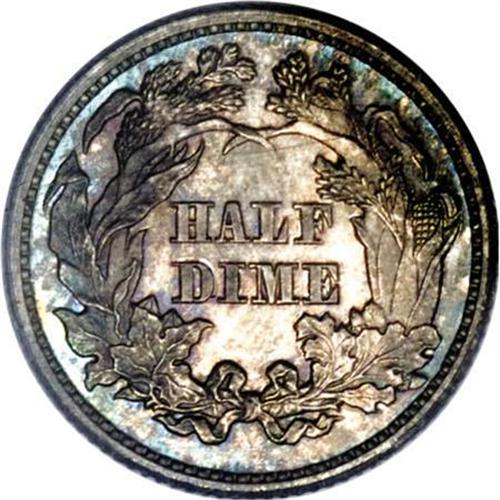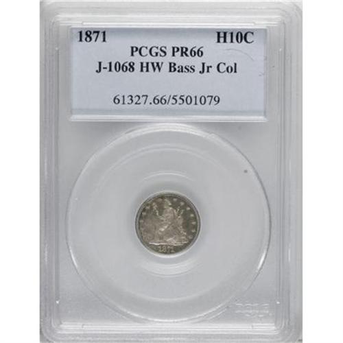 <B>1871 H10C Half Dime, Judd-1068, Pollock-1204, High R.7, PR66 PCGS.</B></I> Liberty is seated facing left on the obverse. The date is below. She is wearing an Indian headdress and holding a liberty pole with her right hand. Her left hand rests on a globe inscribed LIBERTY. A circle of 13 stars surrounds her. The reverse design is the same as was used to coin regular-issue half dimes. Struck in silver with a reeded edge. About a half dozen silver strikings are known, and examples were also produced in copper and aluminum. Deeply mirrored, the fields on each side show pronounced die striations. Mottled gray-russet and blue toning is seen over each side. This is the finest certified by the two major services.<BR><I>Ex: Stanley Kesselman; Bass I (Bowers and Merena, 5/99), lot 1079.</B></I><BR><BR><b>Shipping:</b> Coins & Currency (<a target="_blank" href="http://www.heritageauctions.com/common/shipping.php">view shipping information</a>)