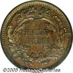 <B>1871 H10C Half Dime, Judd-1069, Pollock-1205, R.7. PR64 Brown PCGS.</B></I> James Longacre's "Indian Princess" design features Liberty facing left, wearing an Indian Headdress. Her right hand supports a pole topped by a Liberty Cap, and her left hand rests on a globe that is inscribed LIBERTY. Two flags behind Liberty are draped down behind the globe. The field has 13 stars around with the date below. The reverse is from the regular production half dime die that was first introduced in 1860. Struck in copper with a reeded edge. This example has lovely olive-brown color with reflective mirrored fields and iridescent toning. Approximately half a dozen of these pattern half dimes are known.