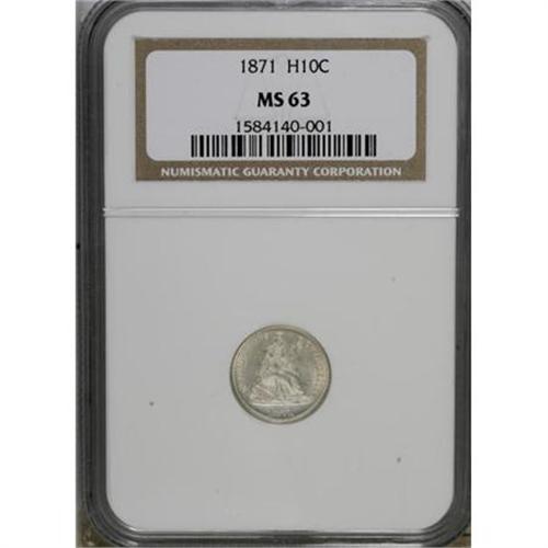 <B>1871 H10C MS63 NGC.</B></I> NGC Census: (85/154). PCGS Population (62/125). Mintage: 1,873,960. Numismedia Wsl. Price for NGC/PCGS coin in MS63: $179. (#4398)<BR><BR><B>Coin Engraver:</B> Christian Gobrecht<BR><BR><b>Shipping:</b> Coins & Currency (<a target="_blank" href="http://www.heritageauctions.com/common/shipping.php">view shipping information</a>)