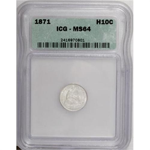 <B>1871 H10C MS64 ICG.</B></I> NGC Census: (113/42). PCGS Population (78/46). Mintage: 1,873,960. Numismedia Wsl. Price for NGC/PCGS coin in MS64: $292. (#4398)<BR><BR><B>Coin Engraver:</B> Christian Gobrecht<BR><BR><b>Shipping:</b> Coins & Currency (<a target="_blank" href="http://www.heritageauctions.com/common/shipping.php">view shipping information</a>)