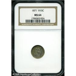 <B>1871 H10C MS64 NGC.</B></I> Warm amber and cinnamon hues heat up the edges of this diminutive issue, while cooler tones are seen in the centers. Some weakness in strike is noted at the top part of the reverse and on the rock that Liberty sits upon on the obverse. Lot:6149