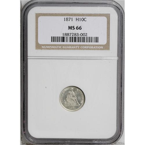 <B>1871<H10C> MS66 NGC.</B></I> A superlative type coin and among the finest certified survivors of this late date issue. The strike is bold for this issue, though some weakness is apparent in the upper left (facing) wreath. Both sides are snow-white and untoned. Census: 12 in 66, 2 finer (7/06).
