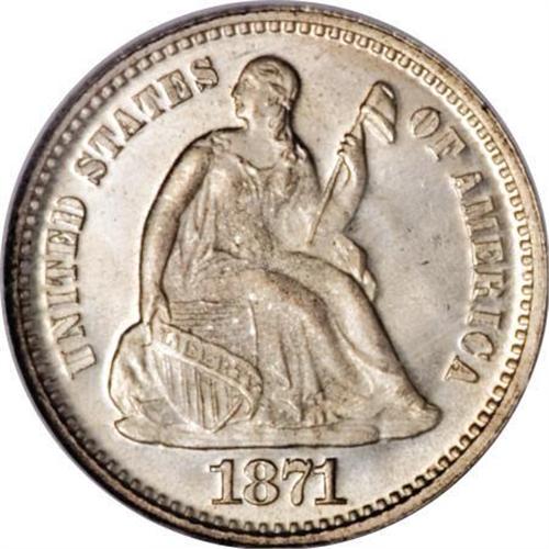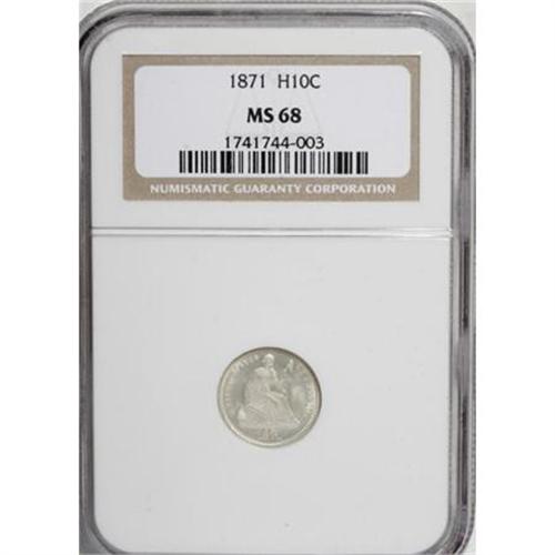 <B>1871 H10C MS68 NGC.</B></I> The devices of this amazing jewel have fully brilliant and frosty silver luster, surrounded by equally brilliant but satin fields, nearly prooflike in their appearance. The obverse die is heavily rusted and lapped, with a large section of the design entirely polished away. Census: 2 in 68, 0 finer (1/08).<BR><I>From The Southwest Collection.</B></I><BR><BR><B>Coin Engraver:</B> Christian Gobrecht<BR><BR><b>Shipping:</b> Coins & Currency (<a target="_blank" href="http://www.heritageauctions.com/common/shipping.php">view shipping information</a>)