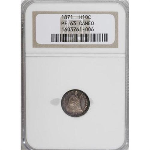 <B>1871 H10C PR63 Cameo NGC.</B></I> Light golden-gray color dominates, and is accented with wisps of cobalt-blue and lavender. Sharply struck design elements enhance the Cameo contrast. A few minor handling marks define the grade.<BR><BR><b>Shipping:</b> Coins & Currency (<a target="_blank" href="http://www.heritageauctions.com/common/shipping.php">view shipping information</a>)