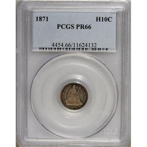 <B>1871 H10C PR66 PCGS.</B></I> Caramel-gold and sea-green are distributed across the obverse. The reverse has a golden-brown center framed by peripheral ocean-blue. Liberty's waist has a granular appearance, as made from a rusted die. A scant 960 proofs were struck. Population: 14 in 66, 1 finer (4/07).<BR><BR><b>Shipping:</b> Coins & Currency (<a target="_blank" href="http://www.heritageauctions.com/common/shipping.php">view shipping information</a>)