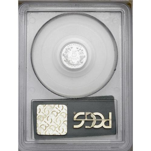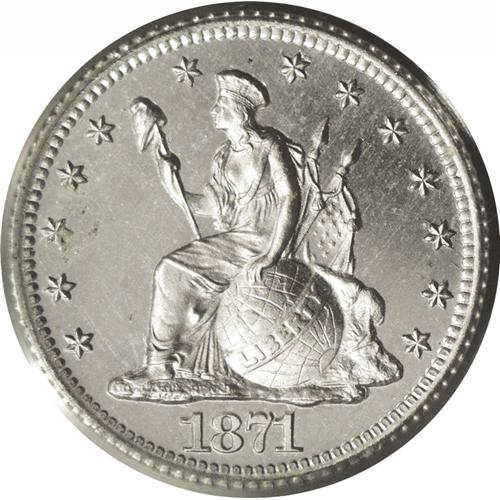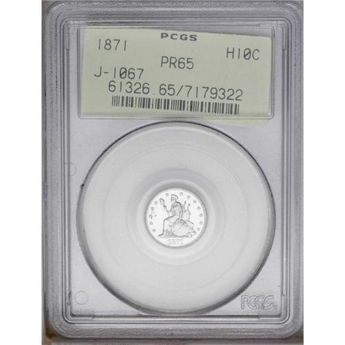 <B>1871<H10C> Standard Silver Half Dime, Judd-1067, Pollock-1202, R.8, PR65 PCGS.</B></I> Longacre's Indian princess design is featured on the obverse, here featured with stars around the periphery, and paired with a reverse featuring the denomination inside of a wreath of cotton and corn and the inscription STANDARD above, i.e., the "Standard Reverse" design of 1870. Struck in aluminum with a reeded edge. Boldly executed throughout and attractive for a Gem proof example of this issue. The surfaces have a trace of verdigris on the left obverse near the third star. On the reverse there is a minor planchet streak extending at an angle up to the left from the upper left ribbon bow, and these can be used for future pedigree tracing. Examination of the plates from the Sieck/Rothert coin do not appear to match and that may be a different specimen than offered here, but with the quality of photographs from that period, this may never be known and this could be the same coin sold in those previous sales. USPatterns.com says "fewer than 3 confirmed," which certainly implies that either two or just one exist of this issue. Housed in an older green insert PCGS holder, this is the only example of this pattern issue graded by NGC or PCGS. An important opportunity for the pattern specialist. <BR><BR><B>Important notice:</B> Heritage usually auctions material at the rate of 200-250 lots per hour. On some occasions eBay Live bid software or the Internet may not be able to keep up with the pace of the auction. We recommend placing a realistic absentee bid now as insurance to avoid disappointment. Occasionally the auctioneer may eliminate or reject an eBay Live bid, and the auctioneer may also reopen a lot after the close of the eBay live bidding (usually because we missed an audience bid), and may reject your bid even if it shows you as the winning bidder. By bidding via eBay Live, you agree that Heritage may award the lot to another bidder at its sole discretion under the circumstances described above or any other reasonable circumstances. Since eBay bids are not shown to us until we open the lot on the floor, we treat those bids just like floor bids. In most cases the floor responds before the eBay bid is presented to us, due to Internet lag time, so for consistency we have made it a policy that floor bids are always considered first over tie eBay live bids. Also please note that all Heritage lots purchased through eBay Live carry a 20% Buyer's Premium. Please make sure you read the Terms and Conditions before you bid. This lot is being auctioned in conjunction with a live floor auction by Heritage Galleries & Auctioneers. All final auction and invoice information will be supplied by Heritage Galleries & Auctioneers, and all other information should be considered preliminary. Lot:1849 <BR><BR><B>Winning Notification and Billing:</B> After the FINAL session in this auction is complete, Heritage will send e-mail and snail mail invoices. This process normally takes several days. All final auction and invoice information will be supplied by Heritage Galleries & Auctioneers, and all other information should be considered preliminary. <BR><BR>This auction will be conducted on a live auction floor and over the Internet through eBay Live. If you choose to place an absentee bid, please take a moment to <font color='#0000ff'><u><a href='http://pages.ebay.com/liveauctions/help/before/laabsentee.html'>learn how eBay Live absentee bidding works</a></u></font><font color='#000000'>