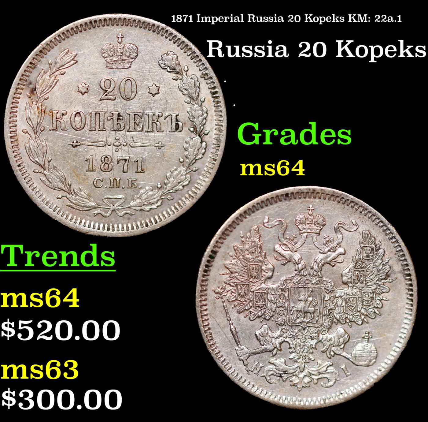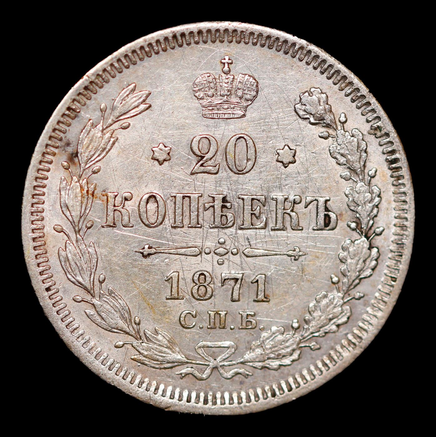 1871 Imperial Russia 20 Kopeks KM: 22a.1 Grades Choice Unc.