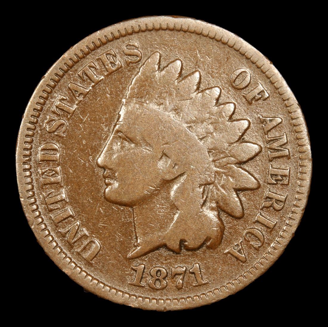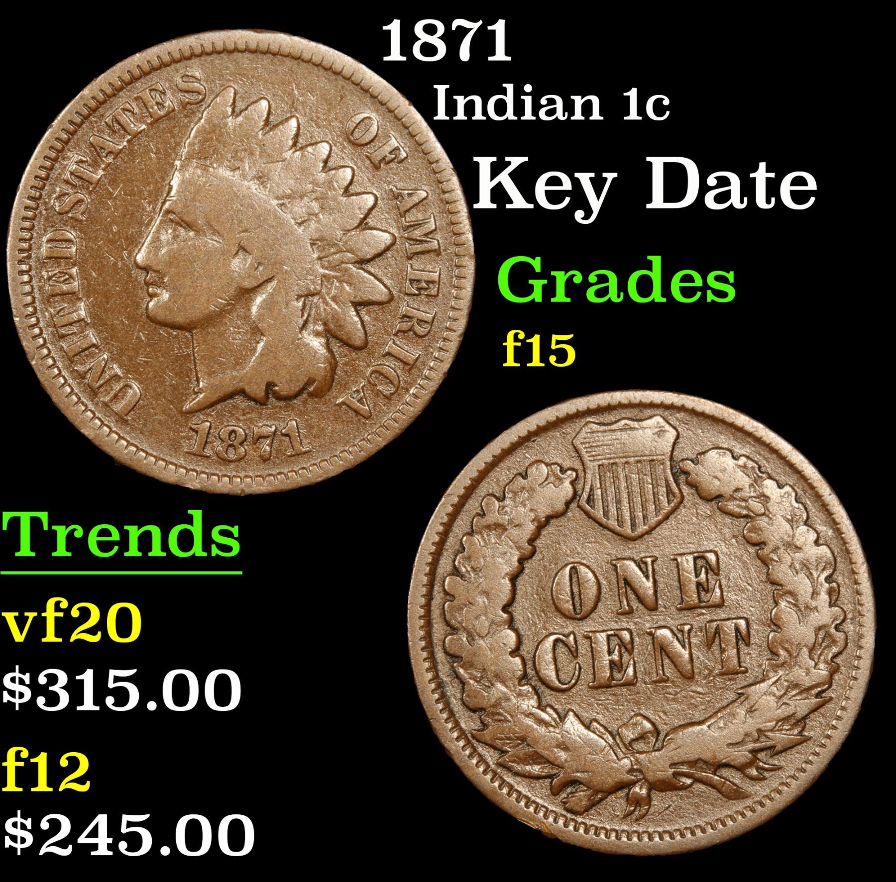 1871 Key Date . Indian Cent 1c Grades f+. Quoting PCGS :"The 1871 Indian Cent is one of the lowest mintage issues of the series. In fact, from 1859 - 1876 it is the lowest mintage coin in the Indian Cent series. What's even worse is that during the early 1870's the Mint was melting a lot of previously issued cents, including many 1871 cents. Making the coin become scarcer. A semi key date to the series with possibly about 5,000 examples in existence in all grades combined."