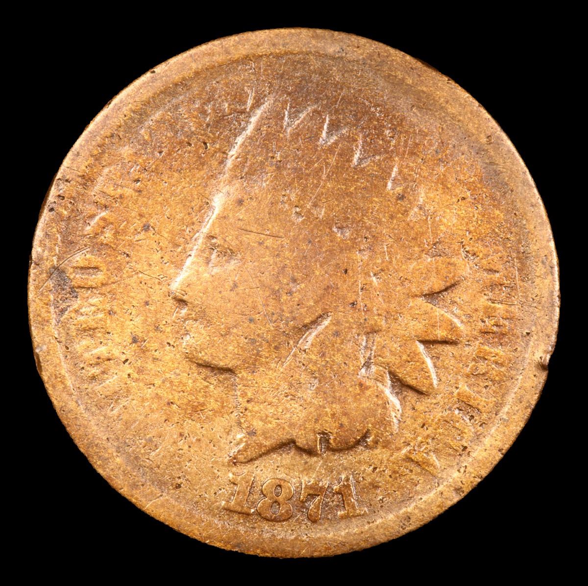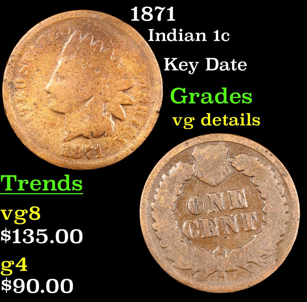 1871 Key Date . Indian Cent 1c Grades vg details. Quoting PCGS :"The 1871 Indian Cent is one of the lowest mintage issues of the series. In fact, from 1859 - 1876 it is the lowest mintage coin in the Indian Cent series. What's even worse is that during the early 1870's the Mint was melting a lot of previously issued cents, including many 1871 cents. Making the coin become scarcer. A semi key date to the series with possibly about 5,000 examples in existence in all grades combined."