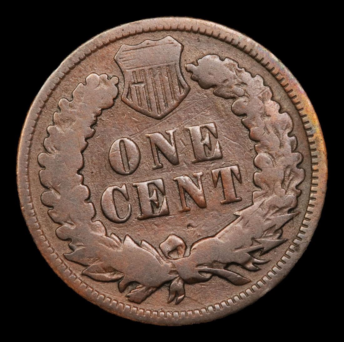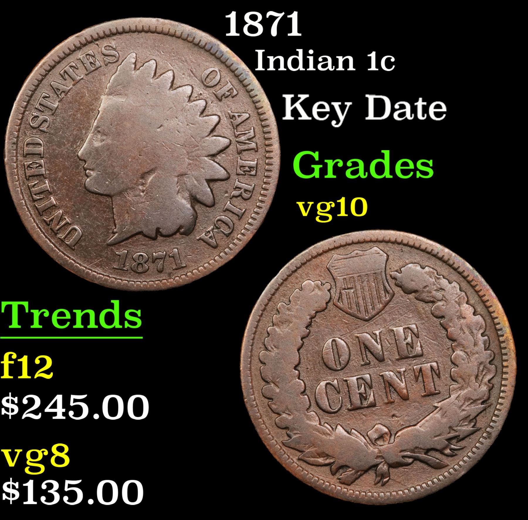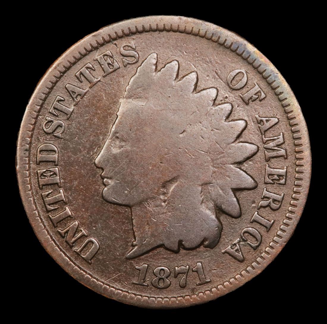 1871 Key Date . Indian Cent 1c Grades vg+. Quoting PCGS :"The 1871 Indian Cent is one of the lowest mintage issues of the series. In fact, from 1859 - 1876 it is the lowest mintage coin in the Indian Cent series. What's even worse is that during the early 1870's the Mint was melting a lot of previously issued cents, including many 1871 cents. Making the coin become scarcer. A semi key date to the series with possibly about 5,000 examples in existence in all grades combined."