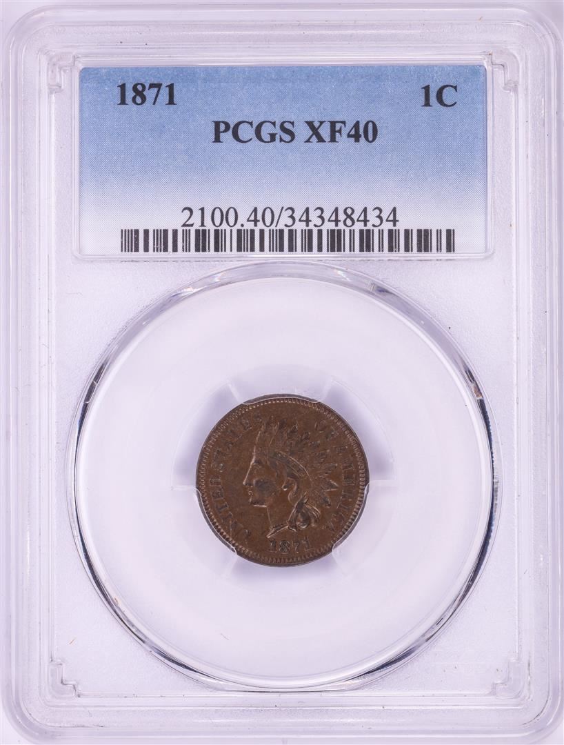 One 1871 Indian Head Cent Coin PCGS XF40. PCGS Graded.