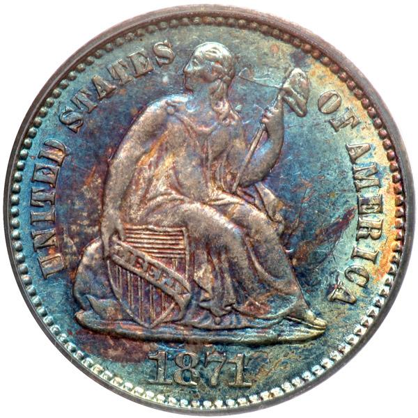 1871. PCGS graded MS-63 PQ. The obverse displays beautiful blue toning (PCGS # 4398) .