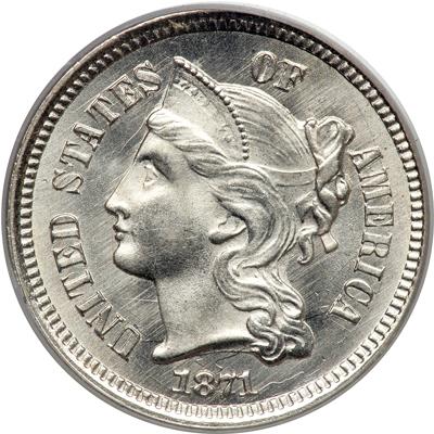 1871 Nickel Three Cents. PCGS graded MS-65. Untoned and well struck. The surfaces glisten with headlight bright nickel-silvery color that will make your head spin. Pop 47; 21 in 66; 1 in 67. (PCGS # 3737).
