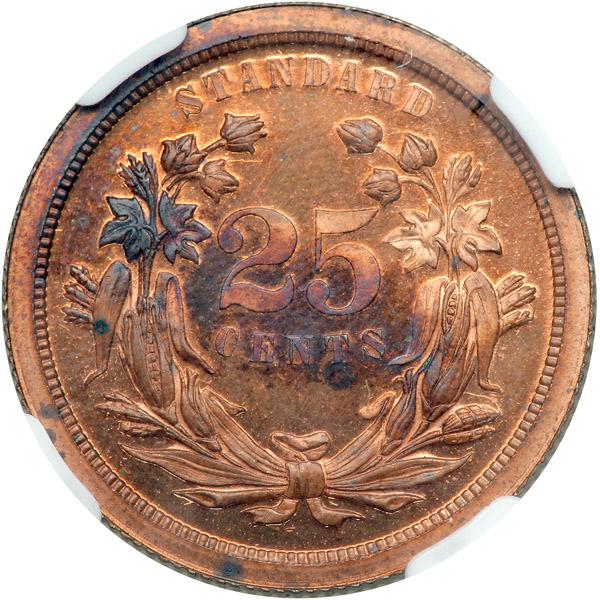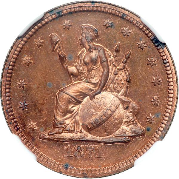 1871 Pattern Quarter Dollar. Copper, reeded edge. NGC graded Proof 63 Red & Brown. Loaded with mint red. We note some scattered fly specks here and there. The reverse carries the STANDARD reverse -- there was also a STANDARD SILVER reverse on certain Patterns of 1869-71 which sometimes confuses first-time collectors as to which is which since they looked almost identical. Pop 2; 2 in 66 RB (PCGS # 71356) .