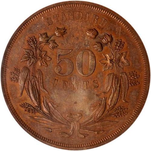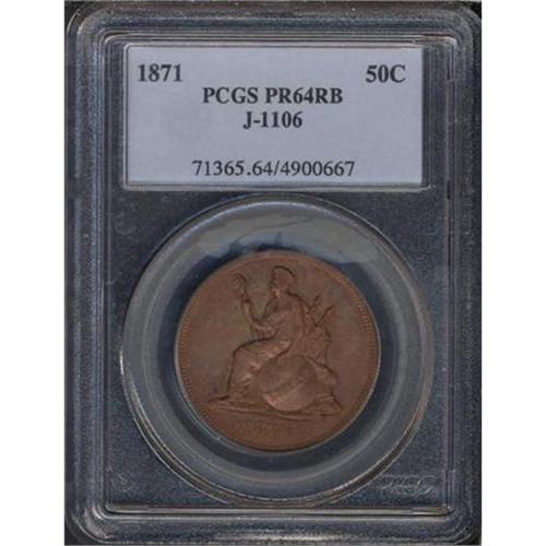 <b>1871 Pattern Half Dollar. Copper. J-1106. PCGS graded PF64 RB.</b> This features the very beautiful Indian princess design first created by Longacre (who died in January 1869, but his design lived on). The obverse without stars has a charming cameo quality about it and may take its lead from the earlier 1836-39 Gobrecht dollars as well as the 1837-38 No Arrows seated coinage as its immediate predecessor. On Judd-1106, the reverse consists of 50 CENTS in a wreath of cotton and corn, with STANDARD above the wreath. Lovely surfaces, exciting color with natural toning haze, and a very crisp sharp strike on all devices <b>(PCGS # 71365)</b> <i>