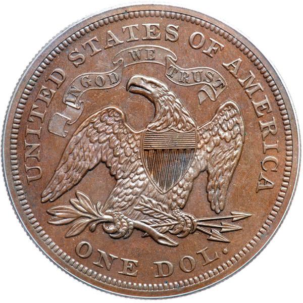 1871 Pattern Silver Dollar. Copper, reeded edge. PCGS graded Proof 65 Brown PQ. CAC Approved. Lovely natural toning on both sides. Pattern collectors delight in the seated Indian Princess designs of 1870-73, and this rare variety highlights the series! Virtually all the survivors have been sent to the grading services, given the current reported populations some force. On offer is a premium gem brown Proof example, the surfaces are fresh and clean, glowing, with exquisite color and a touch of gold shimmering iridescence. One or two lint marks below IN GOD on the reverse are an artifact of the minting process, we note them for accuracy but they in no way compromise the beauty of the piece.