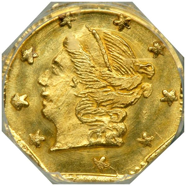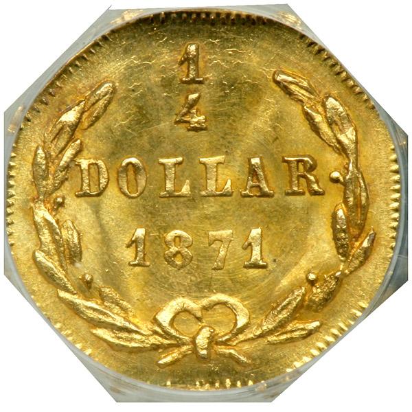 1871 Quarter Dollar Octagonal. NGC graded MS-65. Frosty and lightly toned. A solid little Gem whose luster gleams. Pop 7; 6 finer.