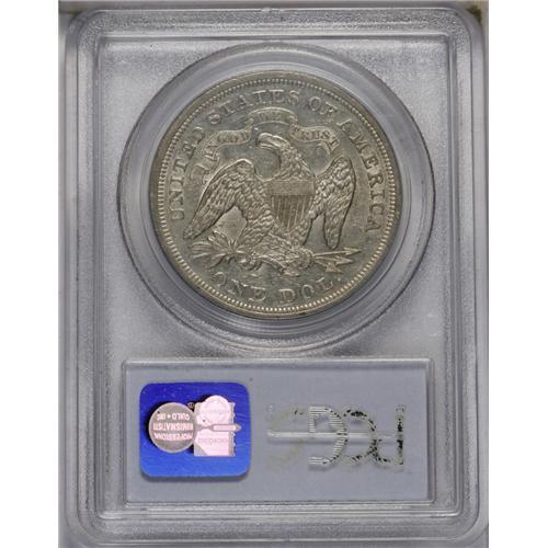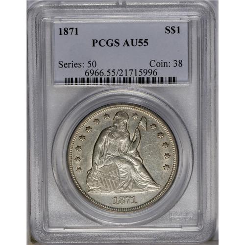 <B>1871<img border='0' src='http://www.heritagecoins.com/images/star.gif' width=10 height=10>$1> AU55 PCGS.</B></I> Hints of mint luster peek through under light, hazy gray toning. Choice and nicely struck. Some highpoint wear and an abrasion in the field to the right of Liberty define the grade. This AU55 example would make an excellent type coin.