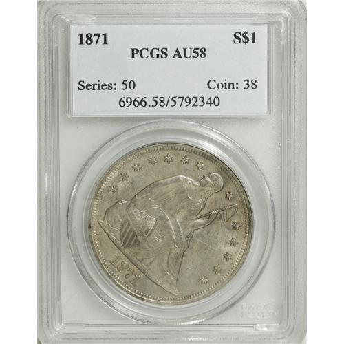 <B>1871 S$1 AU58 PCGS.</B></I> No readily apparent signs of circulation are seen at first glance, but light cabinet friction is noted on Liberty's forward leg on closer examination. A handful of trivial marks are found on the softly shimmering gray-gold surfaces that are accented by lilac highlights. An exceptional example for the assigned grade.<BR><I>From The Greg Southward Collection.</B></I><BR><BR><b>Shipping:</b> Coins & Currency (<a target="_blank" href="http://www.heritageauctions.com/common/shipping.php">view shipping information</a>)