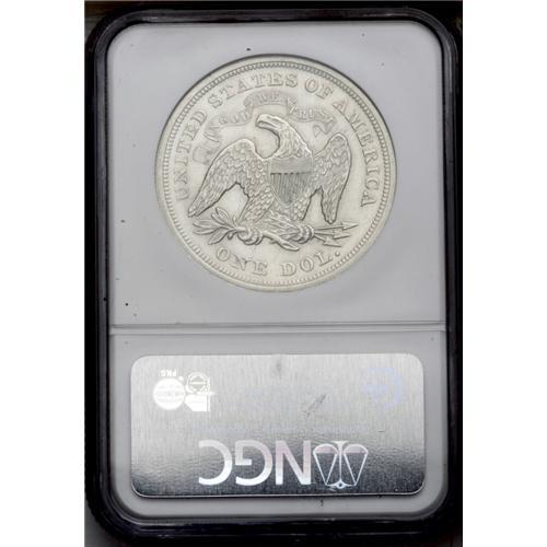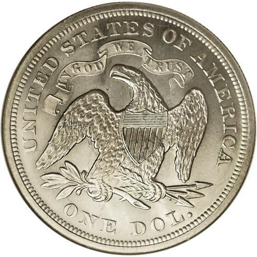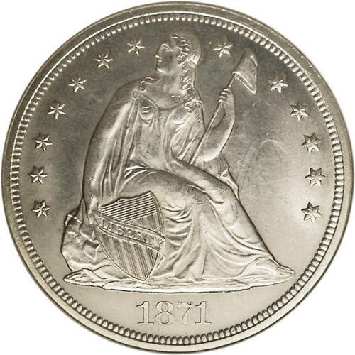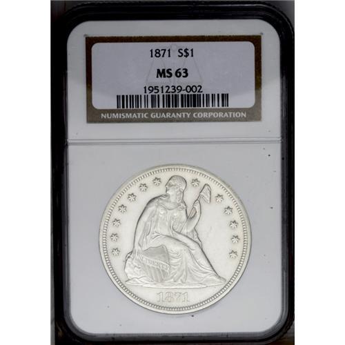 <B>1871<img border='0' src='http://www.heritagecoins.com/images/star.gif' width=10 height=10>$1> MS63 NGC.</B></I> This example has the first-glance appearance of a Gem quality Seated dollar, although close inspection will reveal the minor hairlines and other tiny blemishes that have resulted in a slight grade reduction. Full mint bloom remains visible on each side with brilliant silver surfaces and no indication of toning.