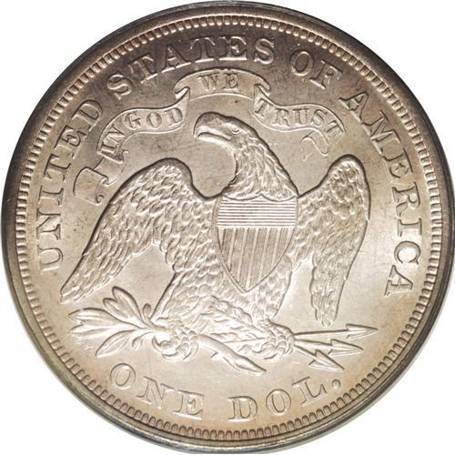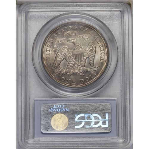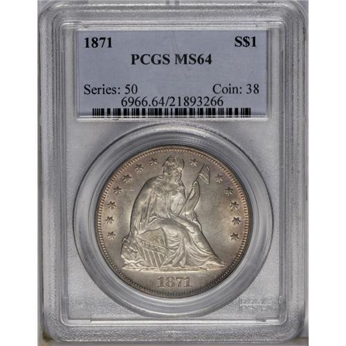 <B>1871<img border='0' src='http://www.heritagecoins.com/images/star.gif' width=10 height=10>$1> MS64 PCGS.</B></I> Both the 1872 and the 1871 are considered the most plentiful Seated dollars produced with the motto IN GOD WE TRUST. As most extant representatives of this issue are circulated to one degree or another, the present example still represents a fleeting opportunity for the high quality type collector. The surfaces are a purple-rose color with a satiny finish and glowing fields. Although not quite full, the strike is still impressive for this often poorly produced series. The near absence of any significant bagmarks give this one the appearance of an even finer grade. Population: 29 in 64, 6 finer (6/06).