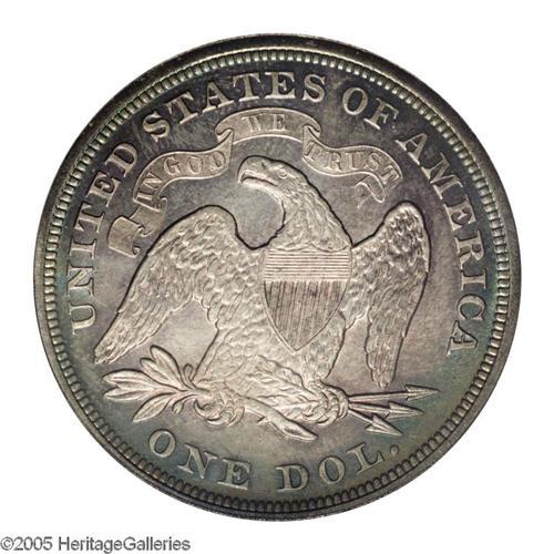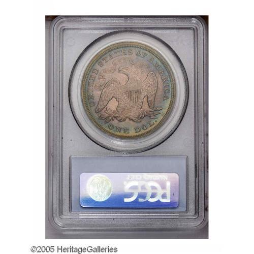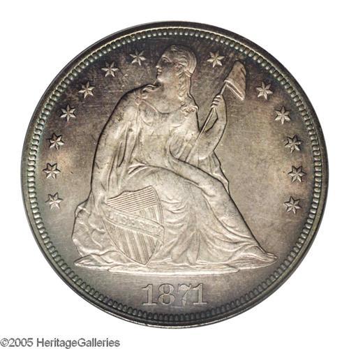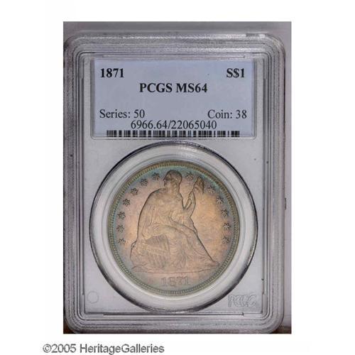 <B>1871<S$1> MS64 PCGS.</B></I> Uniformly bold beneath a coating of lilac-gray and sea-green patina over satiny luster. Most of the noticeable abrasions are confined to the portrait of Liberty, these being the only grade-limiting factors. Population: 29 in 64, 6 finer (11/05).