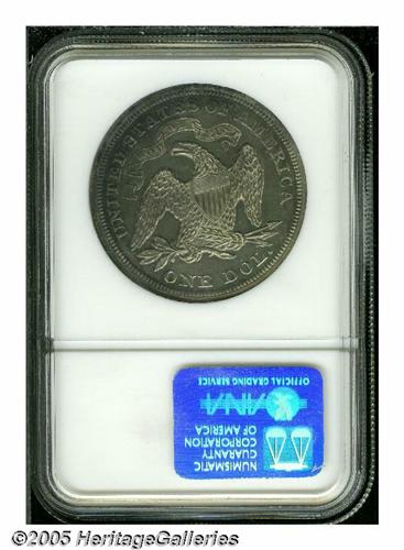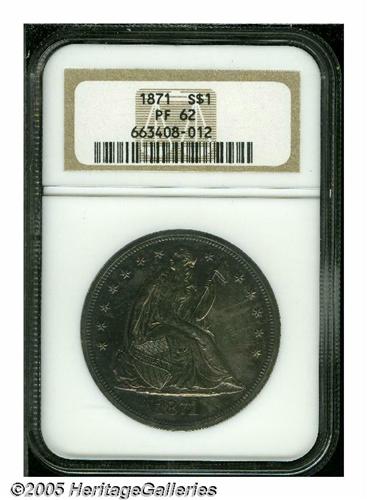 <B>1871<S$1> PR62 NGC.</B></I> The 1871 has been a favorite With Motto type coin with collectors for many years. Sharply detailed with watery fields and a coating of deep purple-rose and charcoal-gray toning over obverse and reverse. A few wispy handling marks are evident on each side of the piece. Population: 26 in 62, 93 finer (6/05).<BR><I>From The Dr. John L. Pellegrini Collection of Liberty Seated Dollars.</B></I>