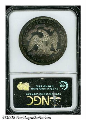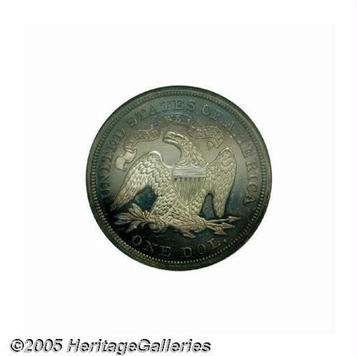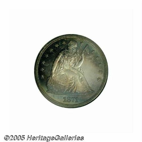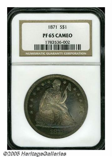 <B>1871<S$1> PR65 Cameo NGC.</B></I> Nicely toned on both sides in a pleasing mixture of reddish-gold and cobalt-blue, leaving ellipses of near brilliance in the centers that allow full appreciation of this Gem specimen's contrast. Only a handful of proofs from this year have certified in Gem or better condition and with the cameo designation. Population: 1 in 65 Cameo, 1 finer (6/05).