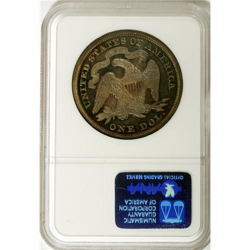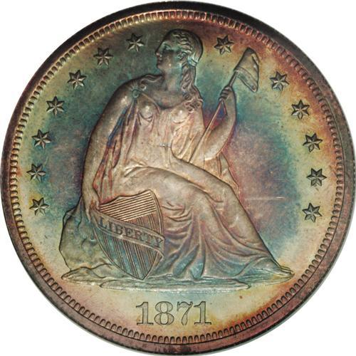 <B>1871 S$1 PR67 NGC.</B></I> A generous 960 proof dollars were minted in this year. Nearly 340 examples have been certified by NGC and PCGS, with the majority of coins falling into the PR62 to PR64 range. The Superb proof specimen in this lot displays a coating of low to medium intensity cobalt-blue, lavender, orange-gold, and yellow-gold patination. Exquisitely impressed design elements further enhance the coin's outstanding eye appeal, as does the cameo-like contrast between the lightly frosted motifs and deeply reflective fields. Close scrutiny with a loupe reveals no significant marks. A simply beautiful proof Seated dollar. Census: 2 in 67, 0 finer (11/06).<BR><BR><b>Shipping:</b> Coin/Currency (<a target="_blank" href="http://www.heritageauctions.com/common/shipping.php">view shipping information</a>)